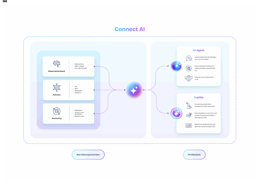 Mit Actions können AI Agents und Copilots eigenständig Aktionen ausführen, Workflows steuern und nahtlos auf externe Systeme wie Shops oder CRM-Plattformen zugreifen. Aufgaben wie das Weiterleiten von Nachrichten, das Anlegen von Notizen oder das Aktualisieren von Kundendaten werden automatisch erledigt, ohne dass menschliches Eingreifen nötig ist.
