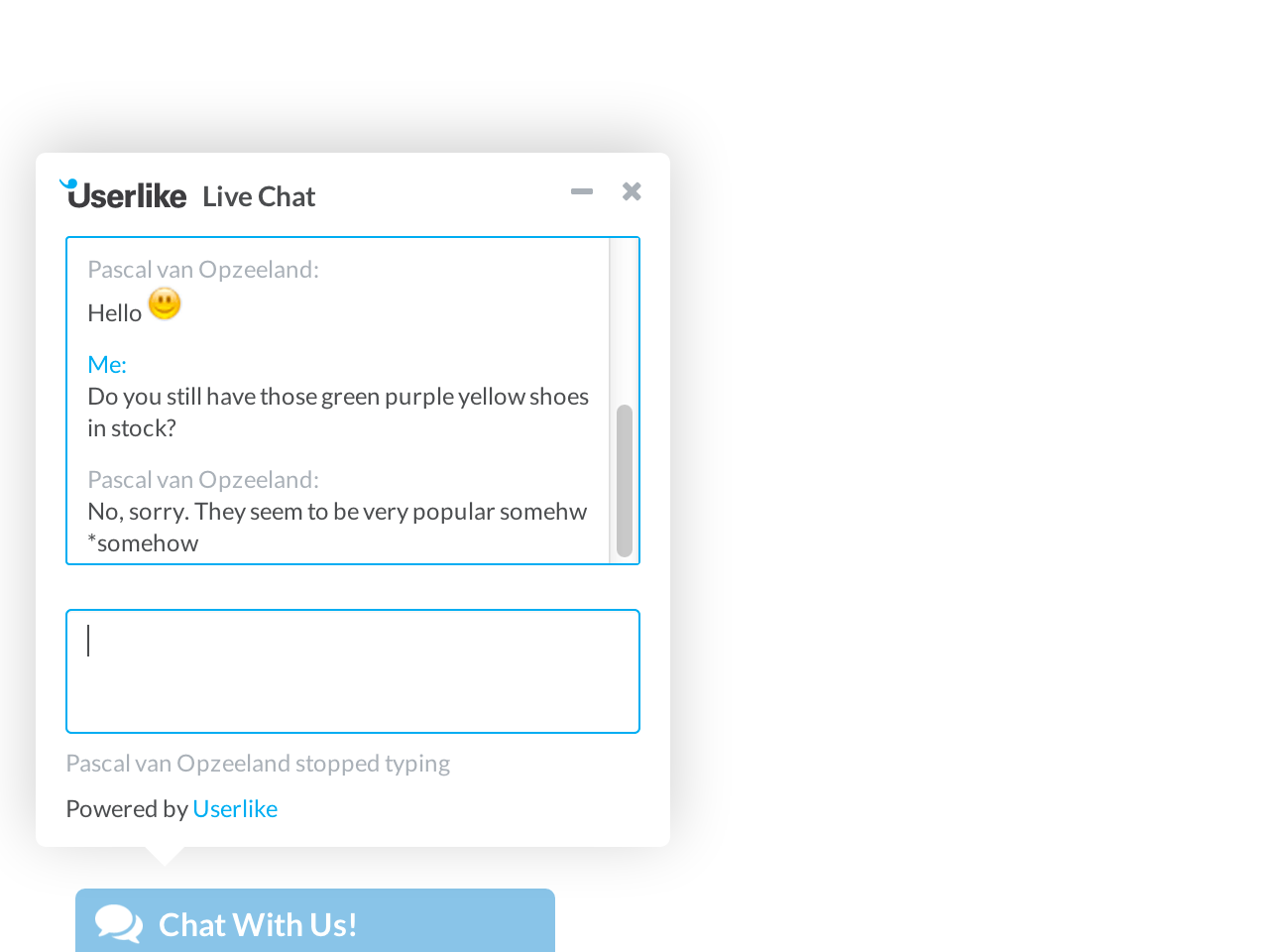 Manche Menschen lesen sich alles, was sie schreiben, doppelt und dreifach durch, bevor sie es absenden. Dies beeinträchtigt die Schnelligkeit eines Chats erheblich, und auch die Produktivität des Mitarbeiters. Einen Tippfehler zu machen ist ganz natürlich, und gehört zu jedem Chat dazu. Es macht Sie sogar noch menschlicher, da Ihr Gegenüber so das Gefühl hat, mit einem Menschen – und nicht mit einer Maschine – zu schreiben. Falls Ihnen ein Tippfehler unterläuft: Bleiben Sie gelassen und korrigieren Sie sich einfach, indem Sie das betreffende Wort mit einem Sternchen korrekt schreibn: *schreiben.