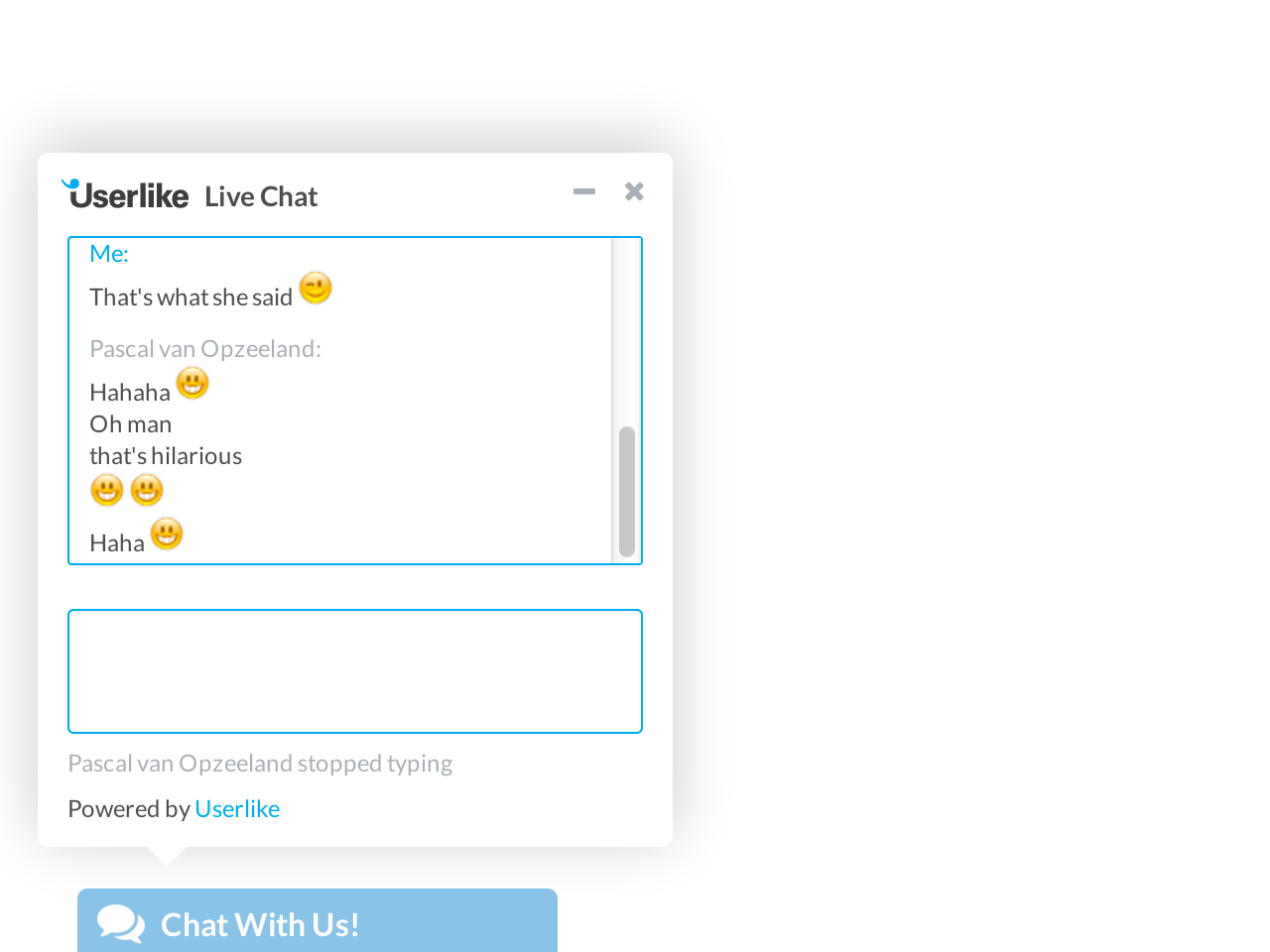 Lachen gehört zu unseren natürlichen Emotionen, und sollte auch beim Chatten nicht einfach ausgeblendet werden. Ein ‘haha’ ist ein gängiges Mittel, um Ihrem Gegenüber zu zeigen, dass Sie seinen Witz verstanden haben. Auch wenn der Witz schlecht sein sollte, wie im Beispiel unten, sollten Sie Ihren Kunden glücklich machen und Ihm ein Lächeln schenken!