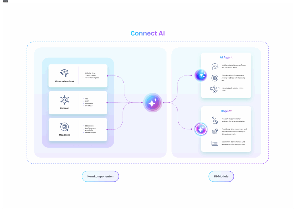 • Automatisierung: AI Agents, digitaler Serviceassistent Copilot, Actions, intelligentes Chat-Routing passend zu Mitarbeiter-Skills, Nachrichtenvorlagen, Live-Übersetzungen, WhatsApp-Newsletter