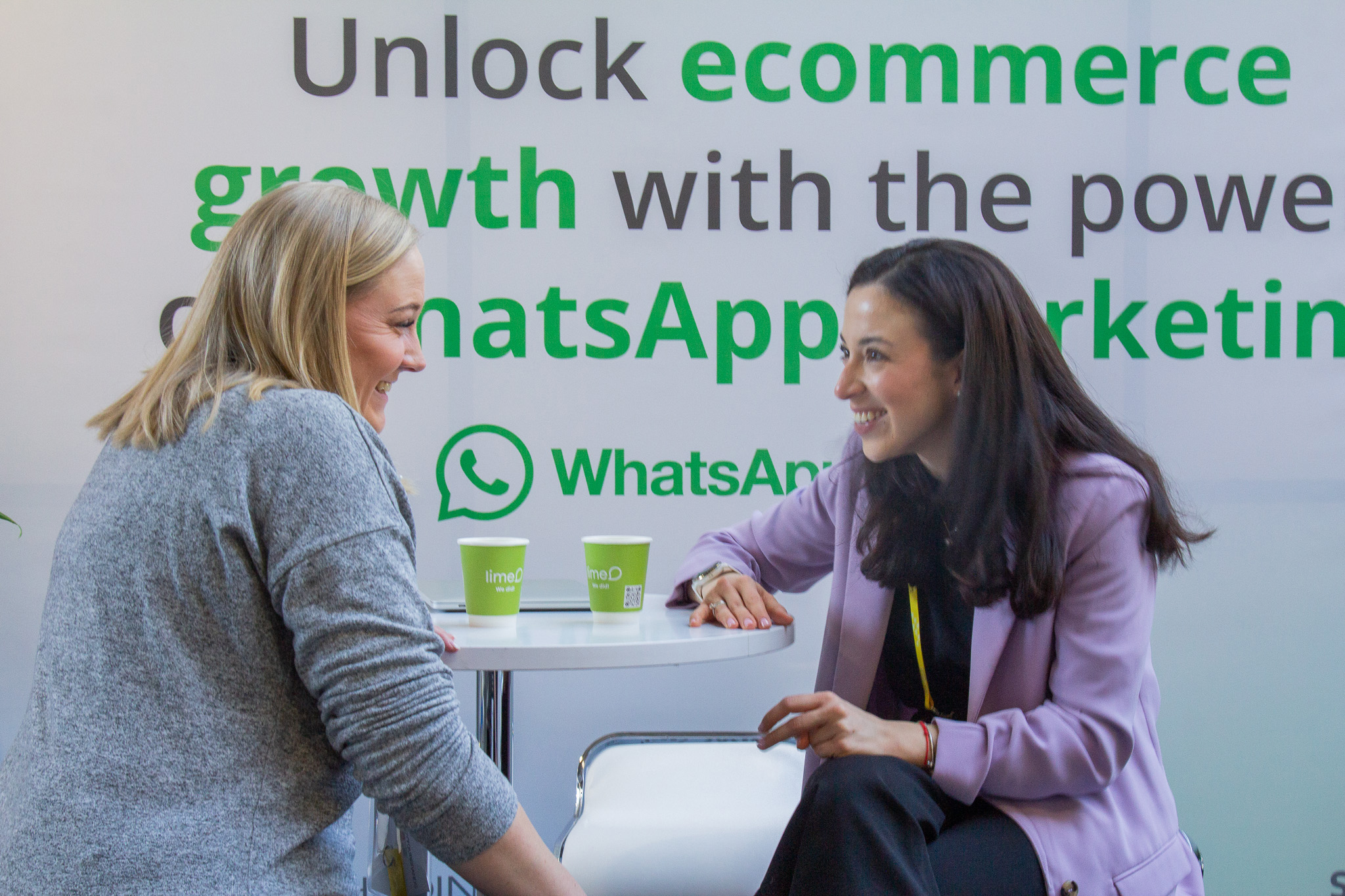 A group of people standing in front of a exhibition stand, smiling and posing for a photo with Lime Connect branding.