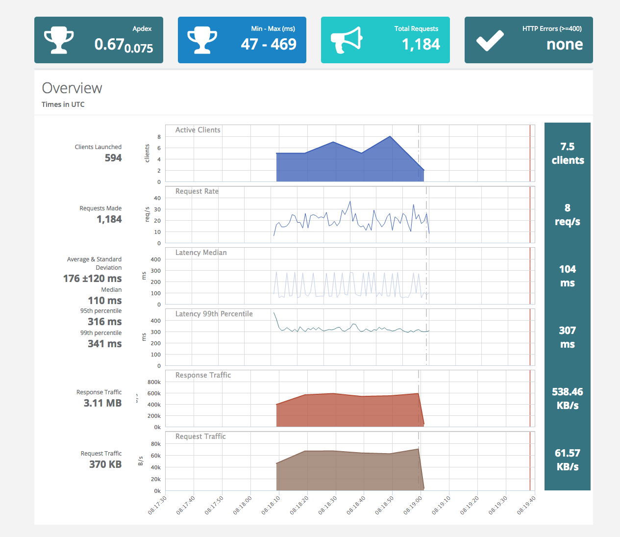 One concern that came up during development was that the new stack was significantly slower than the old one. This isn’t even about “Is MySQL faster than PostgreSQL?”, it can simply happen due to seemingly minor difference in each database’s behavior. After all, what we had before was reasonably optimized for MySQL, since we have been running on it for quite some time. Luckily for us, our friends over at StormForger were interested in more people testing out their product, so we’ve decided to give it a spin to see where we’re at. StormForger is a load testing service, you can configure your websites’ API endpoints and setup up different scenarios to stress your application.