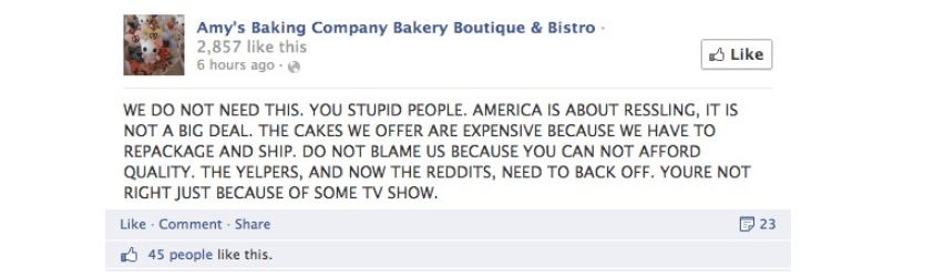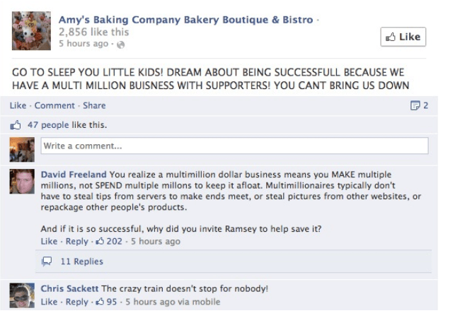 One of the most famous examples of a social media disaster was that of Amy’s Bakery. The business first appeared in the public eye when foul-mouthed chef Gordon Ramsey took it under his wing for the purposes of his TV show, Kitchen Nightmares. For the first time in the history of the show, Gordon was unable to complete the usual transformation and guide the company into being a profitable business. This was due to conflict with the restaurant’s owners, Amy and Samy Bouzaglo whom Ramsey described as being incapable of listening.