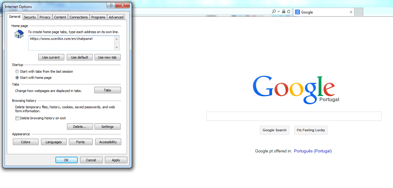 In the Internet Options window, select the “General” tab and then type “https://www.userlike.com/en/chatpanel” into the home page field. Select “Apply” and “Ok”.