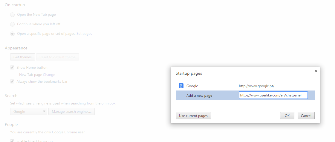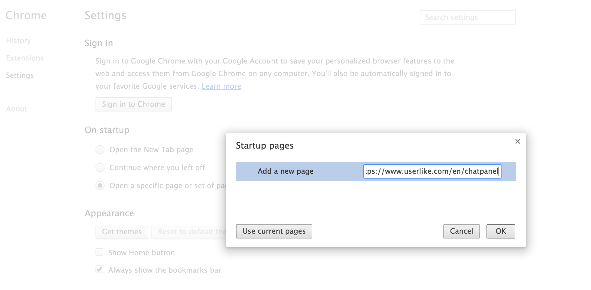 Under the section “On Startup” you will find the option “Open a specific page or set of pages” select this option. A new window will appear asking you to type in the desired URL, there you can insert “https://www.userlike.com/en/chatpanel”.