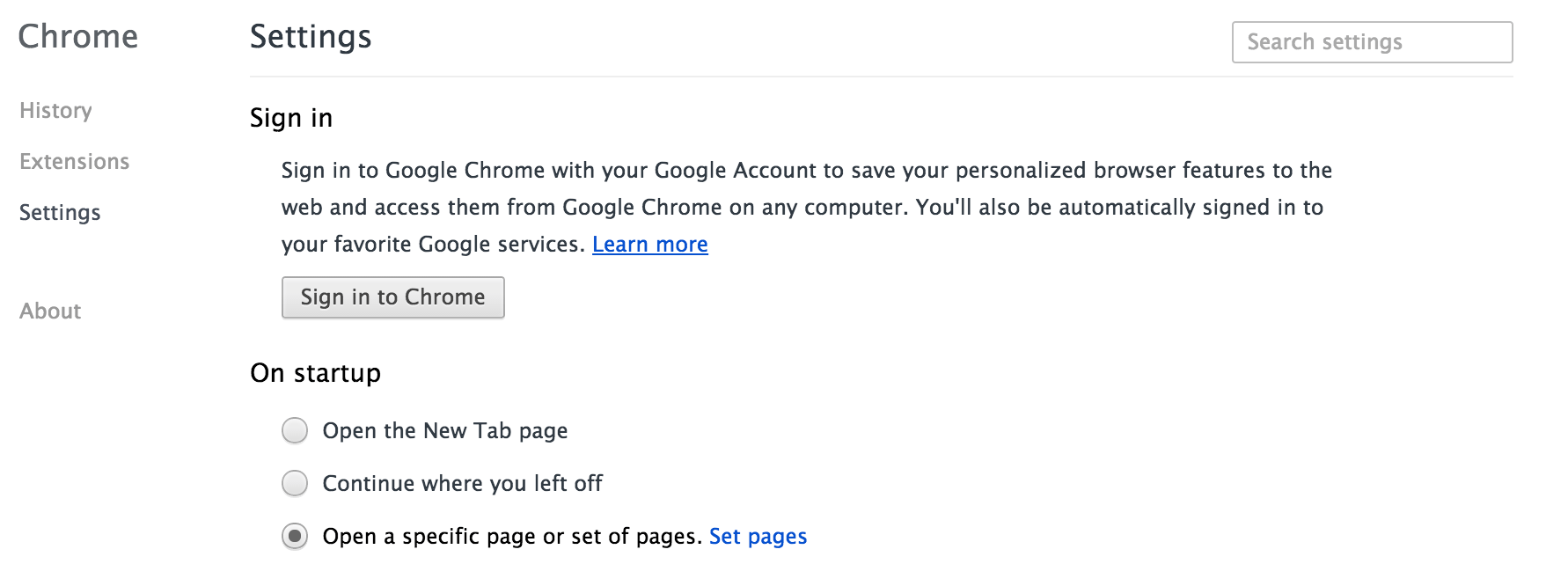 Then open your Chrome, tap into the three stripes in your browser window and then choose “Settings”. A new tab will open with your Settings Preferences. In the section “On startup”, select the option “Open a specific page or set of pages”. You will see a new box with a field to enter a new page in which you should type “https://www.userlike.com/en/chatpanel” and press “Ok”.