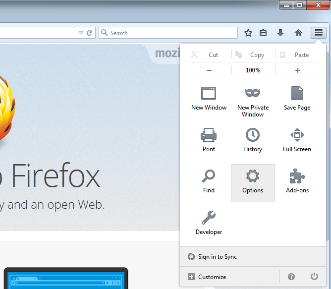 Start by opening a new Firefox window and click on the three stripes for the “Control” Menu. Then select “Options”.