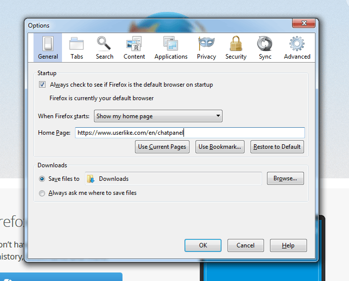 A new window appears where you can set up the startup information details. Select the option “When Firefox starts: Show my homepage” and then type the following URL into your homepage address: “http://www.userlike.com”.