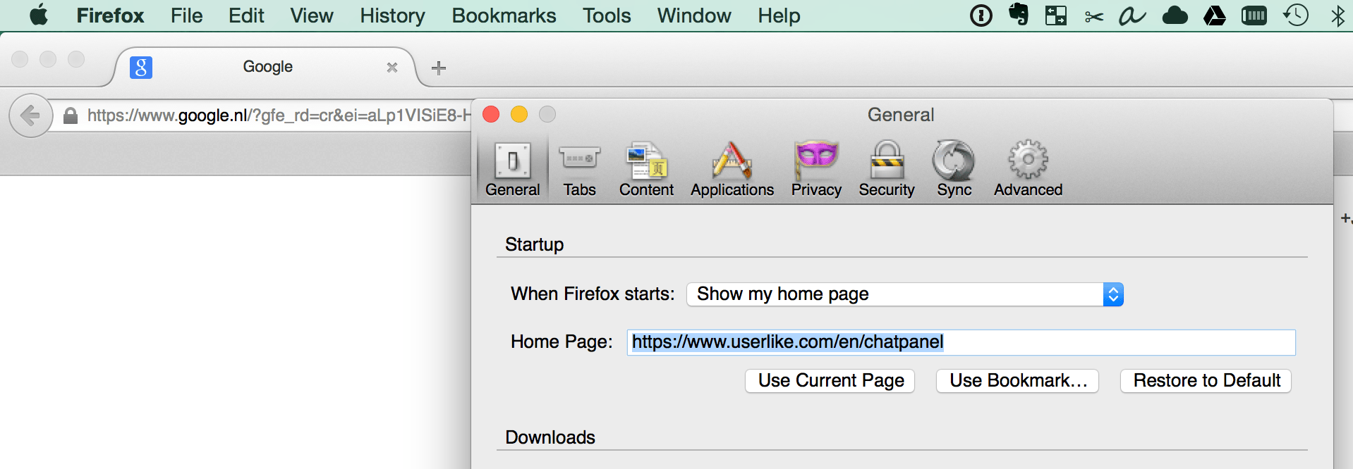 Finally, in the General Tab, insert “https://www.userlike.com/en/chatpanel” in the Homepage input field and you will have successfuly set your automatic Chat Panel Launch.