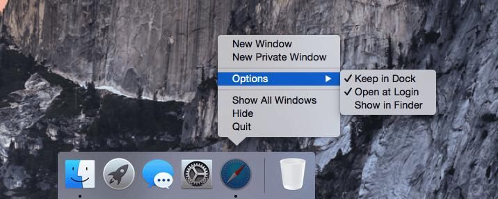 Same as the other browsers, select the Safari icon holding the cmd button. Then select the option “Open at Login”.
