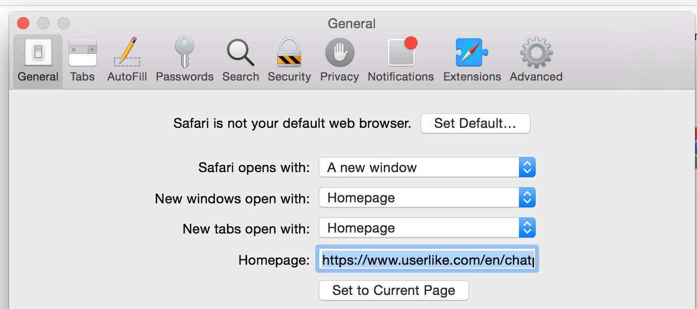 A new window will be opened from where you should enter “https://www.userlike.com/en/chatpanel” into your Home Page input field. There you go, your chat panel will be now automatically opened every time you start your device.