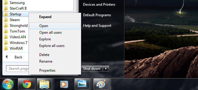From the list, find the folder “Startup”, right click it, and selecting the option “Open”.