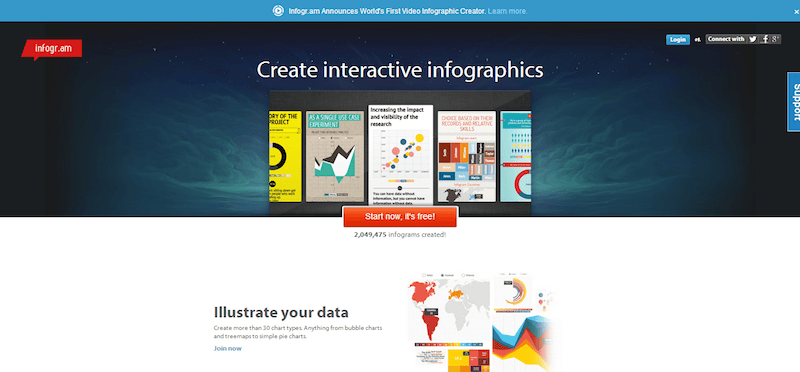 The most famous tool to build your own infographics, with great templates and illustrative elements such as graphs, maps, boxes and demographic representations. Design is the best, even though content production features and diversity of possibilities to actually produce what you envision are quite limited.